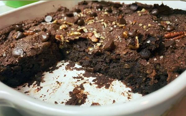 Transfer batter to a parchment-lined baking dish (8x8) and spread into an even layer using a spoon or rubber spatula. Top with pecans and chocolate chips (optional).